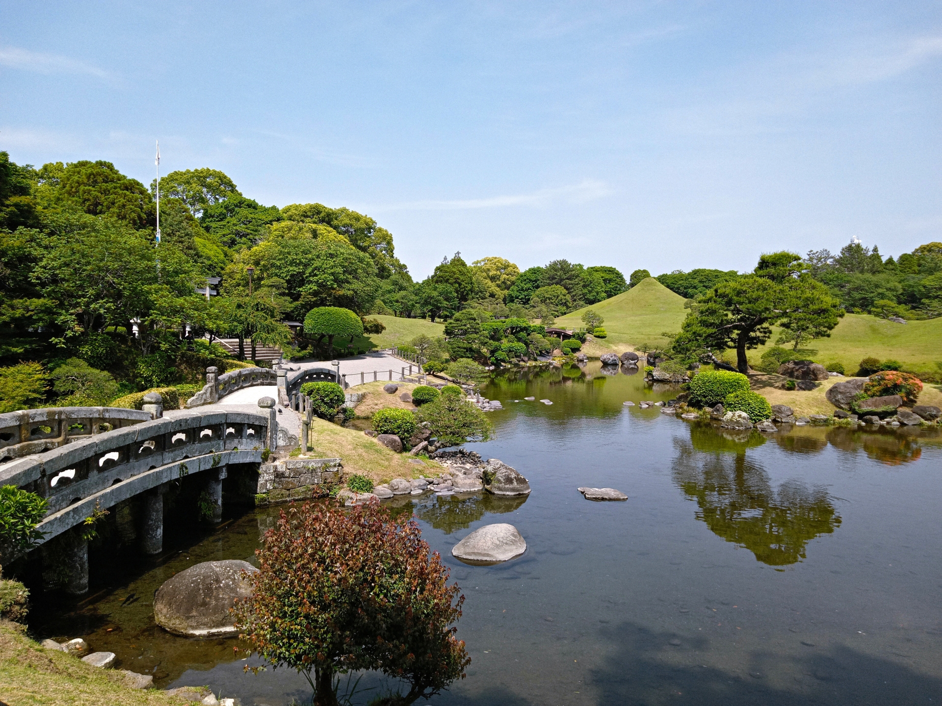 熊本城から市電で15分ほど南下すると、江戸時代初期に肥後藩初代藩主・細川忠利公が築いた水前寺成趣園にたどり着きます。約400年の歴史を誇る桃山式回遊庭園は、東海道五十三次の景勝地を模したと伝えられ、阿蘇の伏流水が湧く澄んだ池を中心に、富士山を模した築山などが配置されています。庭園全体を一周するのに30分ほど。池の水面に映る築山の姿を眺めていると、江戸の庭師たちが描いた「旅の風景」が小さな庭の中に凝縮されていることに気づかされます。入園料は大人400円、小人200円。8時30分から17時まで、年中無休で開園しています。