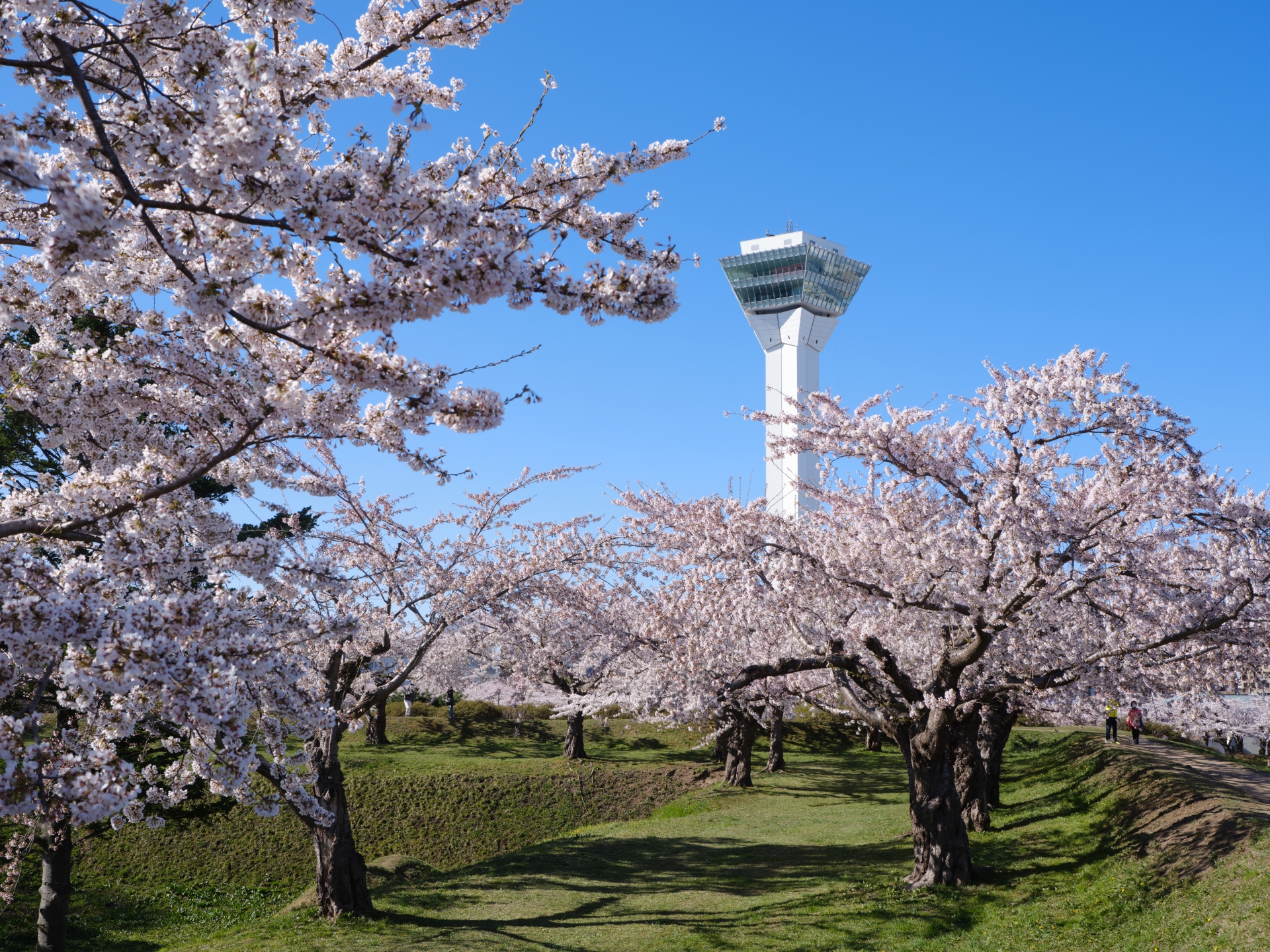 2026年の函館は、五稜郭公園の桜がGWにちょうど見頃を迎えるのがポイント。約1,600本のソメイヨシノが咲き誇る星形の城郭を、五稜郭タワーから見下ろす「上からのお花見」は函館ならではの体験です。夜は19時〜21時のライトアップで幻想的な夜桜も楽しめます。